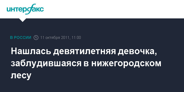 Нижний Новгород. 11 октября. INTERFAX.RU - Девятилетняя жительница Нижегородской области, потерявшаяся в лесу в минувшее воскресенье, во вторник утром сама нашла дорогу к людям.