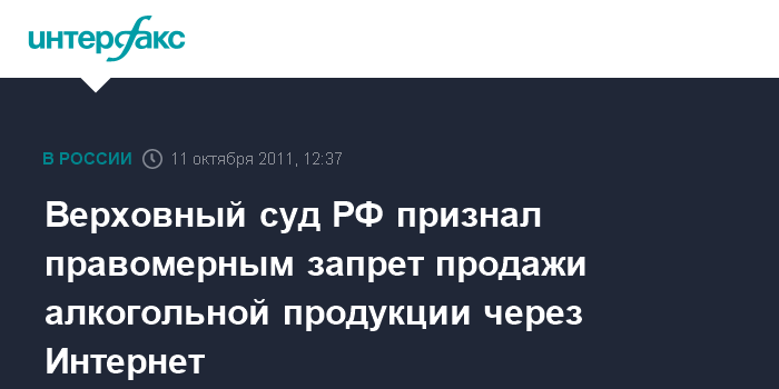 Москва. 11 октября. INTERFAX.RU - Верховный суд РФ признал правомерными нормы закона о дистанционной продаже товаров, ограничивающие торговлю алкоголем через Интернет, сообщает сайт Роспотребнадзора.