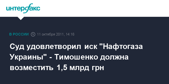 Киев. 11 октября. INTERFAX.RU - Печерский районный суд Киева удовлетворил иск НАК "Нафтогаз Украины", по которому экс-премьер Юлия Тимошенко должна возместить ущерб в сумме около 1,5 млрд грн.