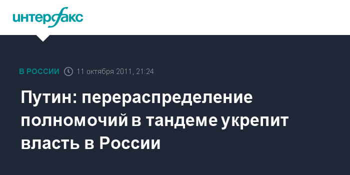 Пекин. 11 октября. INTERFAX.RU - Премьер-министр РФ Владимир Путин уверен, что идеи "тандема" по перераспределению властных полномочий укрепят систему управления страной, и рассчитывает на поддержку избирателей.