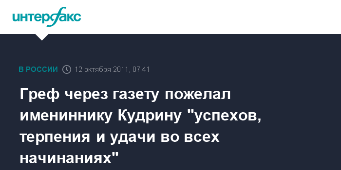 Греф через газету пожелал имениннику Кудрину "успехов, терпения и удачи во всех начинаниях"