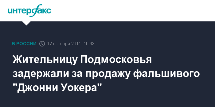 "Сотрудниками полиции в деревне Ленино (Истринский район Московской области - ИФ) была задержана с поличным жительница Подмосковья при получении 1,51 млн рублей за виски "Джонни Уокер Блю Лейбл". Продукция не имела федеральной специальной марки", - сказал собеседник агентства.