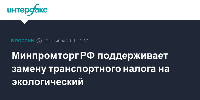 Москва. 12 октября. INTERFAX.RU - Министерство промышленности и торговли РФ поддерживает инициативу по замене транспортного налога на экологический, сообщил директор департамента автомобильной промышленности Минпромторга Алексей Рахманов на конференции, организованной Институтом Адама Смита в среду в Москве.