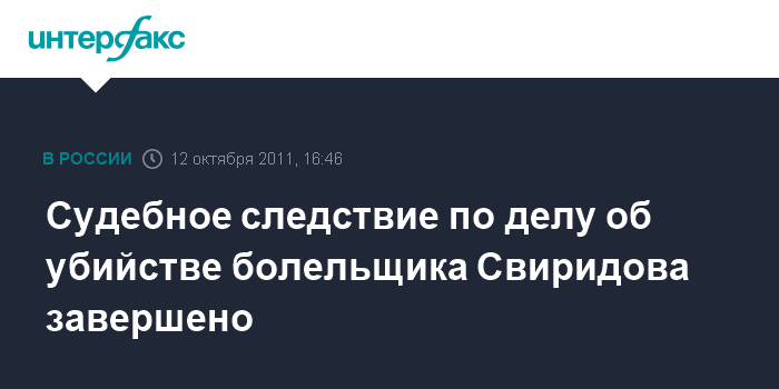 Москва. 12 октября. INTERFAX.RU - Мосгорсуд завершил судебное следствие по уголовному делу об убийстве болельщика "Спартака" Егора Свиридова.