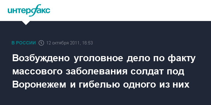 Москва. 12 октября. INTERFAX.RU - Военно-следственные органы возбудили уголовное дело в связи с массовым заболеванием военнослужащих под Воронежем, один из которых скончался.