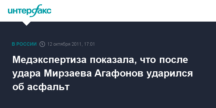 Москва. 12 октября. INTERFAX.RU - Данные медицинской экспертизы смерти 19-летнего Ивана Агафонова, который скончался после удара чемпиона мира по самбо Расула Мирзаева, свидетельствуют о том, что молодой человек погиб от удара об асфальт, и опровергают версию, согласно которой он мог скончаться от падения с каталки в больнице.