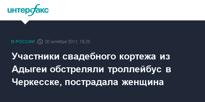 Черкесск. 20 октября. INTERFAX.RU - В столице Карачаево-Черкесии Черкесске участники свадебного кортежа, приехавшего из Адыгеи за невестой, устроили пальбу из травматического оружия по троллейбусу в центре города.