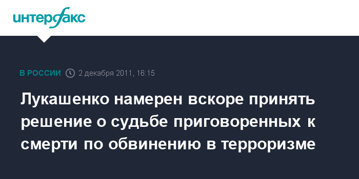 Ивацевичи. 2 декабря. INTERFAX.RU - Президент Белоруссии Александр Лукашенко заявил, что в ближайшее время рассмотрит вопрос, помиловать или нет Дмитрия Коновалова и Вячеслава Ковалева, приговоренных к смертной казни по обвинению в совершении теракта в минском метро.