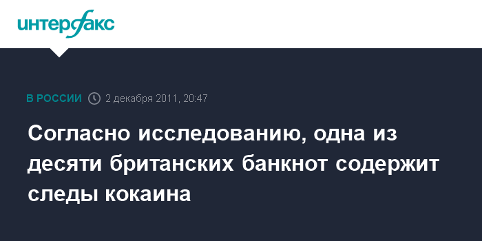 Лондон. 2 декабря. INTERFAX.RU - Каждая десятая банкнота, находящаяся в обращении в Великобритании, "отмечена" следами кокаина, сообщает в пятницу британская газета The Guardian.