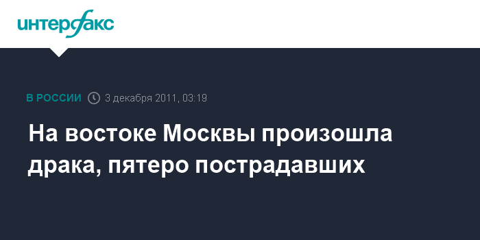 Москва. 3 декабря. ИНТЕРФАКС - В Москве в Восточном административном округе в результате драки, возникшей во время распития спиртных напитков, пострадало пять человек, сообщил "Интерфаксу" источник в правоохранительных органах.