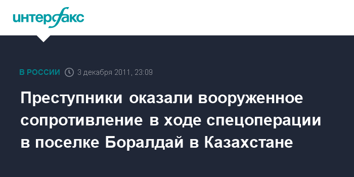 "3 декабря 2011 года около 19 часов 30 минут в поселке Боралдай Илийского района Алматинской области при задержании лиц, подозреваемых в совершении тяжких преступлений, ими оказано вооруженное сопротивление. Преступники блокированы в одном из домов указанного поселка", - говорится в распространенном в субботу сообщении пресс-службы Генпрокуратуры Казахстана.