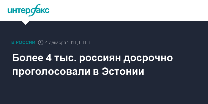 Таллин. 4 декабря. ИНТЕРФАК/BNS - В досрочном голосовании на выборах депутатов Госдумы России в субботу в Эстонии приняли участие 4 тыс. 272 гражданина РФ, постоянно или временно проживающих в республике, сообщила BNS в субботу вечером пресс-секретарь посольства России в Таллине Мария Шустицкая.