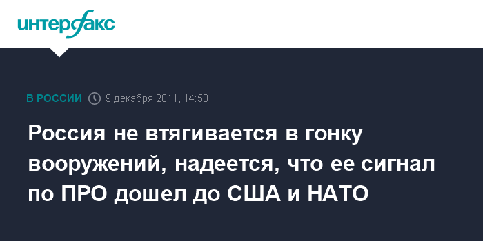 Москва. 9 декабря. INTERFAX.RU - Россия не намерена втягиваться в гонку вооружений, а лишь стимулирует желание США и НАТО договориться с Москвой по ПРО.
