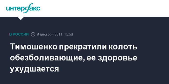 Киев. 9 декабря. INTERFAX.RU - Уполномоченная Верховной Рады Украины по правам человека Нина Карпачева заявляет об ухудшении состояния здоровья экс-премьера Украины Юлии Тимошенко, которая содержится в киевском следственном изоляторе.