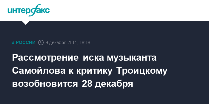 Рассмотрение иска музыканта Самойлова к критику Троицкому возобновится 28 декабря