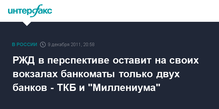 РЖД в перспективе оставит на своих вокзалах банкоматы только двух банков - ТКБ и "Миллениума"