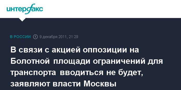 Москва. 9 декабря. INTERFAX.RU - Правительство Москвы не планирует вводить каких-либо ограничений в работе общественного или личного транспорта в связи с запланированным на 10 декабря митингом оппозиции на Болотной площади в центре столицы.