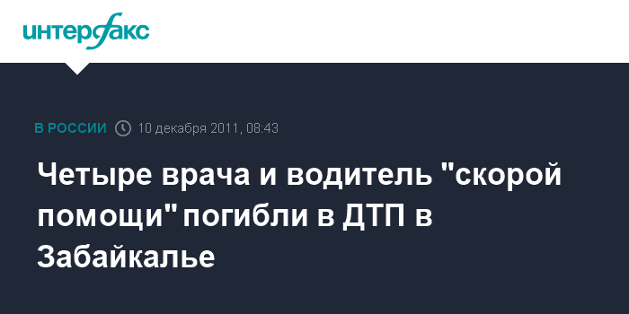 Чита. 10 декабря. ИНТЕРФАКС-СИБИРЬ - Пятеро человек, в том числе четверо врачей "скорой помощи", погибли в результате ДТП под Читой, сообщает в субботу пресс-служба УГИБДД Забайкальского края.