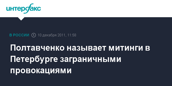 Санкт-Петербург. 10 декабря. INTERFAX.RU - Губернатор Петербурга Георгий Полтавченко называет ежедневные митинги в северной столице под лозунгами "За чистые выборы" спланированной за рубежом провокацией.