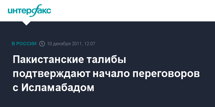 Иерусалим. 10 декабря. INTERFAX.RU - Заместитель командующего пакистанских талибов, которые уже четыре года ведут войну против Исламабада, подтвердил, что они начали переговоры с властями страны, сообщает в субботу израильская газета "Джерузалем пост".
