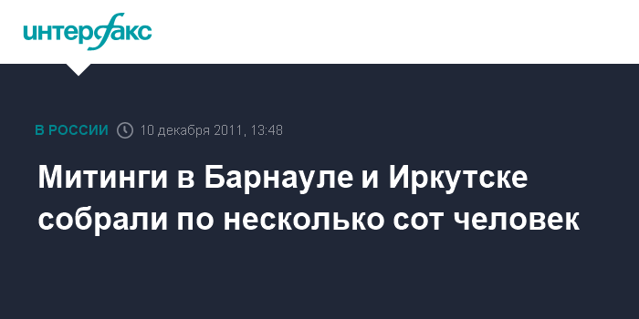 Барнаул/Иркутск. 10 декабря. INTERFAX.RU - В Барнауле (Алтайский край) завершилась четырехчасовая несанкционированная акция протеста против результатов прошедших 4 декабря выборов в Госдуму РФ и Алтайское Заксобрание, передал корреспондент агентства "Интерфакс-Сибирь". Порядка трехсот человек, по данным организаторов акции, в 16:00 по местному времени начали расходиться с площади Советов.
