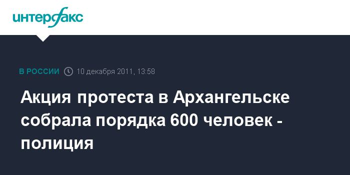 Архангельск. 10 декабря. INTERFAX.RU - По предварительным данным, митинг протеста против итогов выборов собрал в Архангельске порядка 600 человек, сообщили "Интерфаксу" в субботу в региональном УМВД.