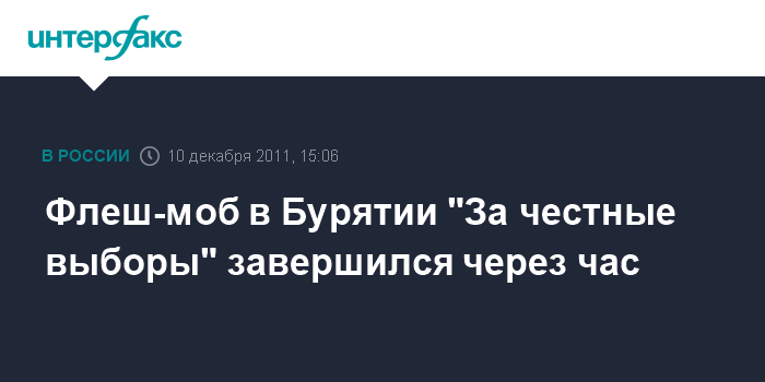 Чита. 10 декабря. INTERFAX.RU - В Улан-Удэ (Бурятия) полиция во время молодежного флеш-моба "За честные выборы" задержала двух человек в нетрезвом состоянии, сообщили агентству "Интерфакс-Сибирь" в пресс-службе республиканского МВД. "Акция прошла на площади Революции, в ней приняли участие не более 50 человек - в основном студенты ", - сказали в пресс-службе.
