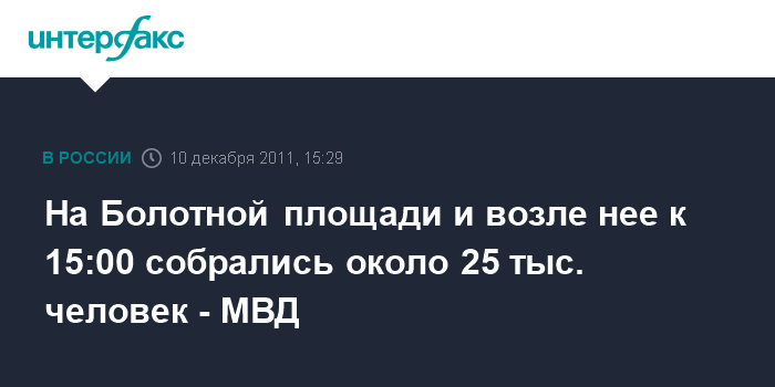 Москва. 10 декабря. INTERFAX.RU - Около 20 тыс. человек собрались на Болотной площади, сообщили "Интерфаксу" в пресс-службе ГУ МВД России по Москве. "На Болотной площади, по состоянию на 15 часов, собралось 20 тыс. человек", - сказали в пресс-службе.