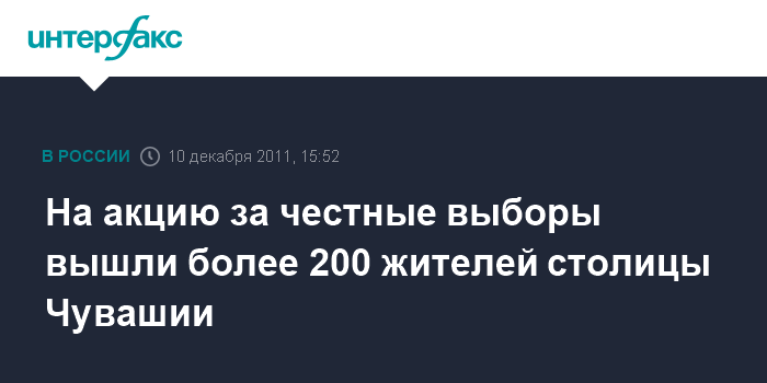 Чебоксары. 10 декабря. INTERFAX.RU - Санкционированная властями акция протеста против фальсификации результатов выборов в Чебоксарах (Чувашия) в субботу собрала более 200 человек, сообщает корреспондент агентства "Интерфакс-Поволжье". Участники стоят с плакатами, скандируют: "Даешь честные выборы!", "Свободу политзаключенным!"