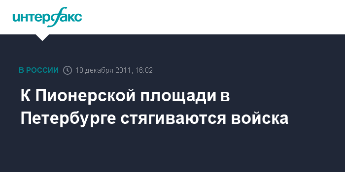 Санкт-Петербург. 10 декабря. INTERFAX.RU - К месту проведения митинга против фальсификации на выборах в Петербурге стягиваются войска, передает корреспондент "Интерфакса". В настоящее время к площади подъехала большая колонна военного автотранспорта и грузовиков, в которых находятся солдаты Внутренних войск.