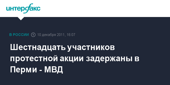 Пермь. 10 декабря. INTERFAX.RU - По уточненным данным пресс-службы УМВД города Перми в ходе акции против итогов парламентских выборов в субботу было задержано 16 человек. "Сотрудниками полиции была пресечена попытка проведения несанкционированного пикета. В отдел полиции N6 Перми для проверки было доставлено 16 человек. Составлено 6 административных протоколов. Из них 2 за мелкое хулиганство, 4 за нарушение установленного порядка организации либо проведения пикетирования", - сообщает пресс-служба ведомства в субботу.