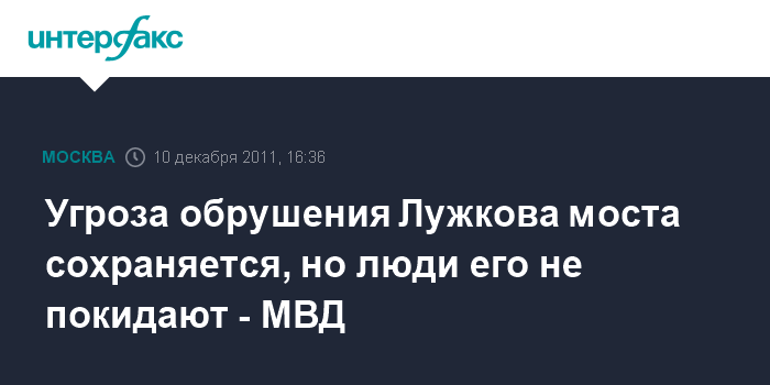 Москва. 10 декабря. INTERFAX.RU - Люди отказываются покидать Лужков мост, угроза обрушения сохраняется, сообщили "Интерфаксу" в пресс-службе ГУ МВД России по Москве. "По состоянию на 16 часов мск субботы число участников митинга, находящихся на Лужковом мосту, остается критичным для конструкции. Призывы организаторов митинга и сотрудников полиции к собравшимся покинуть мост не имели значительного результата", - сказали в пресс-службе.