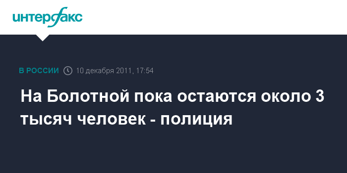 Москва. 10 декабря. INTERFAX.RU - Митинг на Болотной площади завершился, на месте пока остается около 3 тыс. человек, сообщили "Интерфаксу" в ГУ МВД России по Москве. "На данный момент, на Болотной площади остались около 3 тыс. человек, в целом обстановка спокойная", - сказали в пресс-службе.