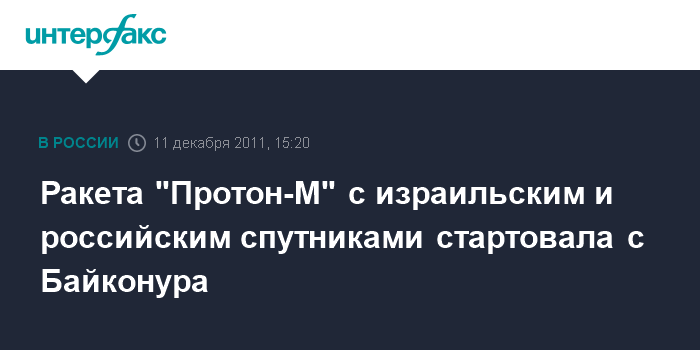 Байконур (Казахстан). 11 декабря. INTERFAX.RU - С космодрома Байконур в воскресенье осуществлен пуск ракеты-носителя "Протон-М" с российским космическим аппаратом "Луч-5А" и израильским телекоммуникационным спутником "АМОС-5" (AMOS-5), сообщает корреспондент "Интерфакса-АВН".