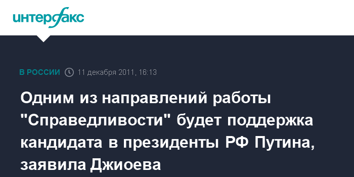 Одним из направлений работы "Справедливости" будет поддержка кандидата в президенты РФ Путина, заявила Джиоева