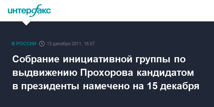 Москва. 13 декабря. INTERFAX.RU - Предприниматель Михаил Прохоров официально уведомил ЦИК России о намерении провести 15 декабря собрание инициативной группы, которая поддержит его самовыдвижение кандидатом в президенты РФ, сообщили в пресс-службе Центризбиркома.