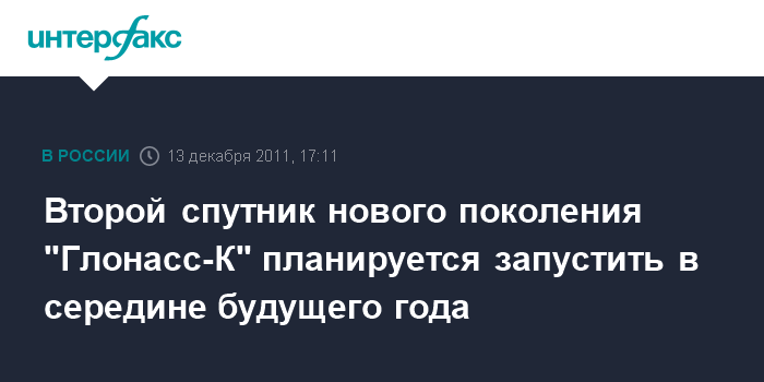Москва. 13 декабря. INTERFAX.RU - Второй спутник "Глонасс-К" будет запущен к середине следующего года, сообщил генеральный конструктор и генеральный директор ОАО "Информационные спутниковые системы" имени академика Решетнева Николай Тестоедов.