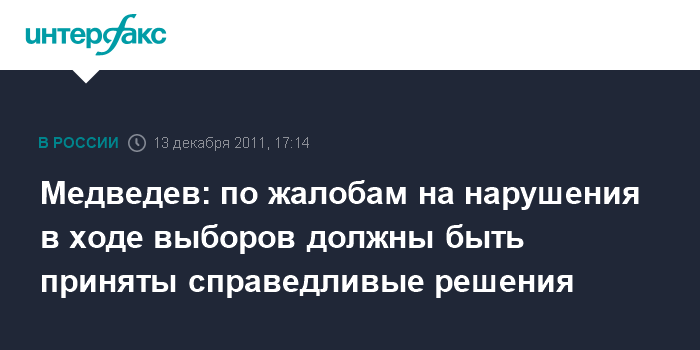 Как сказал Медведев на встрече с лидерами парламентских партий, прошедших в Думу, избирательные комиссии и соответствующие судебные инстанции "обязаны тщательно рассмотреть все жалобы и соответствующие иски, и там, где будут выявлены реальные нарушения, принять справедливые решения".
