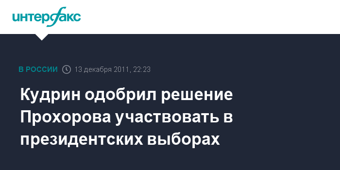 Москва. 13 декабря. INTERFAX.RU - Бывший министр финансов РФ Алексей Кудрин положительно оценивает решение бизнесмена Михаила Прохорова баллотироваться в президенты России. "Я думаю в целом позитивно это оценить", - сказал Кудрин во вторник в эфире радиостанции "Эхо Москвы".