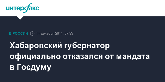 Хабаровск. 14 декабря. ИНТЕРФАКС - ДАЛЬНИЙ ВОСТОК - Заявление об отказе от депутатского мандата в Государственную Думу РФ VI созыва направил в Центральную избирательную комиссию глава Хабаровского края Вячеслав Шпорт.