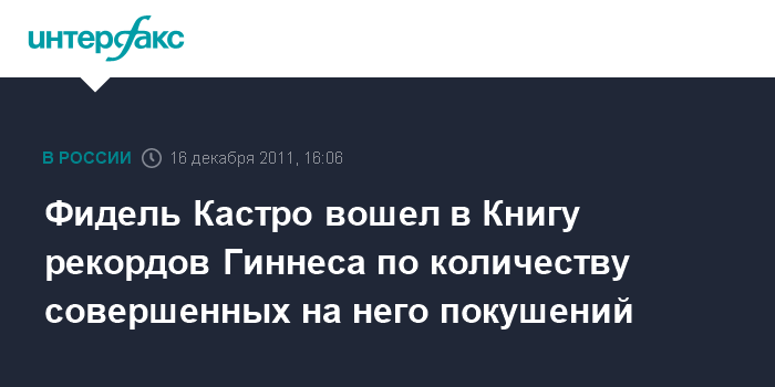 "Исторический предводитель Кубинской революции Фидель Кастро влючен в Книгу рекордов Гиннеса как человек, переживший максимальное количество покушений", - сообщают официальные кубинские СМИ.