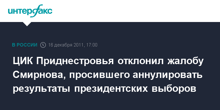 Тирасполь. 16 декабря. INTERFAX.RU - ЦИК непризнанной Приднестровской республики в пятницу отказался удовлетворить жалобу действующего руководителя Приднестровья Игоря Смирнова, который просил признать недействительными итоги первого тура президентских выборов.