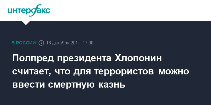 Ессентуки. 16 декабря. INTERFAX.RU - Полпред президента в Северо-Кавказском федеральном округе (СКФО) Александр Хлопонин заявил, что не против введения смертной казни для террористов.