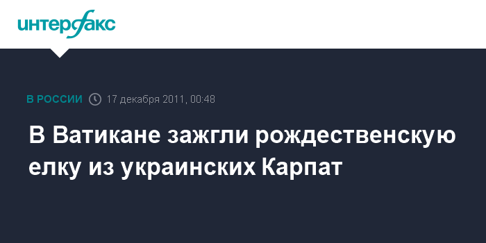 Ватикан. 17 декабря. ИНТЕРФАКС-УКРАИНА - В пятницу вечером в Ватикане на площади Святого Петра прошла официальная инаугурация рождественской елки, привезенной из украинских Карпат.