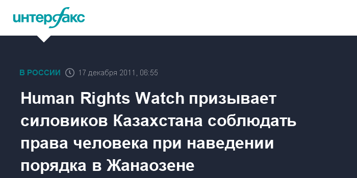 Алма-Ата. 17 декабря. ИНТЕРФАКС-КАЗАХСТАН - Международная правозащитная организация Human Rights Watch (HRW, наблюдение за правами человека) призвала правоохранительные структуры Казахстана соблюдать права человека при наведении порядка в городе Жанаозене Мангистауской области.