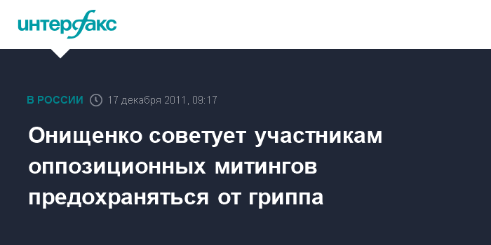 "Надо соизмерять эффективность стояния на митинге с угрозой контаминации друг друга вирусами гриппозной и негриппозной этиологии", - сказал в субботу "Интерфаксу" руководитель Роспотребнадзора, главный государственный санитарный врач РФ Геннадий Онищенко.