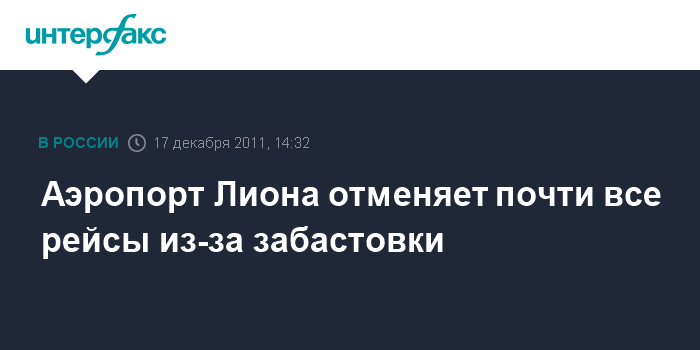 Париж. 17 декабря. INTERFAX.RU - Руководство аэропорта французского города Лиона отменило подавляющее большинство запланированных на субботу рейсов из-за забастовки сотрудников службы безопасности, сообщает сайт газеты "Фигаро". Выяснилось, что не отменены 23 из 111 авиарейсов.
