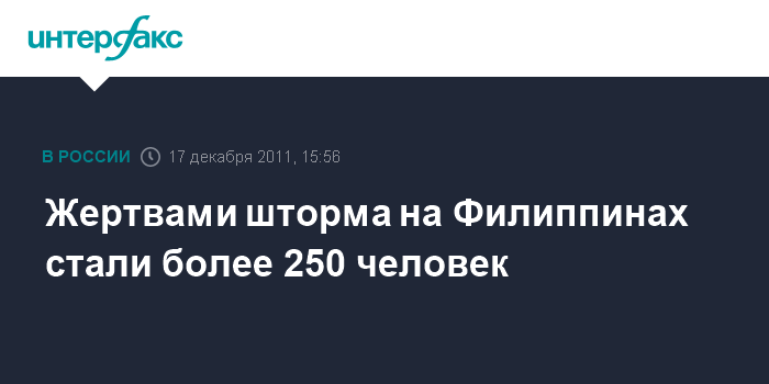 Манила. 17 декабря. INTERFAX.RU - Не менее 256 человек погибли, около 400 считаются пропавшими без вести из-за сильного тропического шторма, обрушившегося на юг Филиппин, объявили в субботу местные власти. В военном командовании страны сообщили, что армия провела срочную эвакуацию 2 тыс. человек, из-за наводнений оказавшихся отрезанными от окружающего мира. Спасатели предупреждают, что число жертв стихии, скорее всего, продолжит расти.