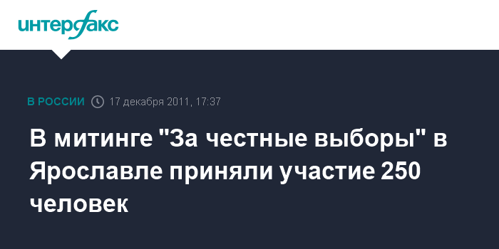 Ярославль. 17 декабря. INTERFAX.RU - Митинг "За честные выборы" состоялся в субботу на площади Юности в Ярославле. Как сообщил "Интерфаксу" начальник отдела информации и общественных связей МВД по Ярославской области Александр Шиханов, на площади собрались 250 человек.
