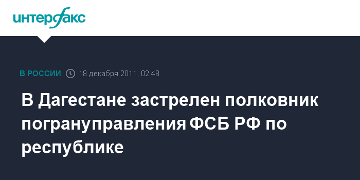 Ростов-на-Дону. 18 декабря. ИНТЕРФАКС-ЮГ - Заместитель начальника управления собственной безопасности погрануправления ФСБ РФ по Дагестану убит неизвестными в городе Каспийске, сообщили агентству "Интерфакс-Юг" в правоохранительных органах республики.